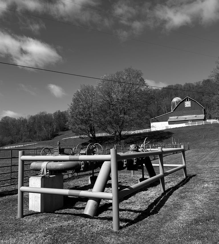 This Farm & Pipeline Inspection infrastructure, (PIG) is a part of the fracking process. It has been built into the ground of this nonproductive well-kept farm. It cleans the natural gas of impurities and radioactivity from the fracking process which includes drilling deep, extensive vertical and horizontal lines. Then the (PIG) Natural Gas travels to the compressor station and eventually into pipelines to markets.